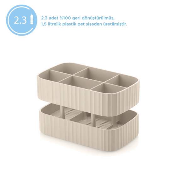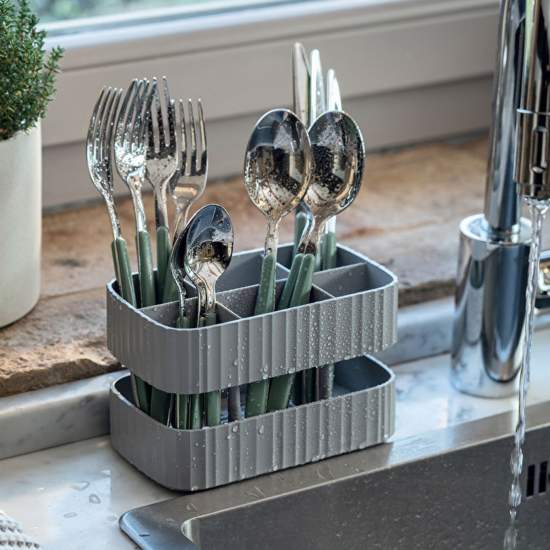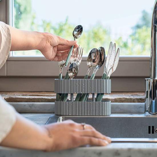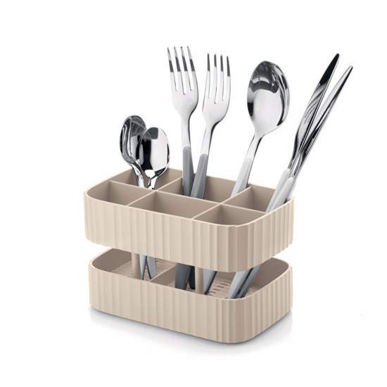 Guzzini Large Cutlery Brown Features Practical, compact cutlery basket with six compartments and two different heights to help you keep different types of cutlery separate. The integrated lower bowl collects excess water. It is easy to clean and can be washed in the dishwasher. can be divided into three parts. 2.3 Made from antibacterial durable plastic that reduces bacterial growth by recycling 100% post-consumer disposable plastic detergent bottles.