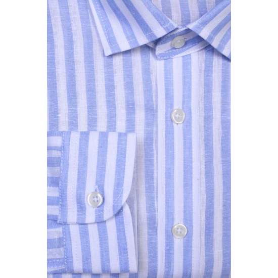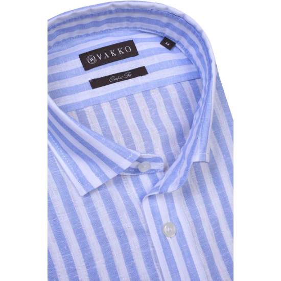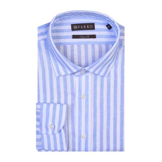 COLOR: Blue PRODUCT ID: M300082413 BRAND: VAKKO PRODUCT GROUP: Shirt FABRIC TYPE: Woven MATERIAL: 55% Cotton, 45% Linen LIFESTYLE: Contemporary MODEL: Striped Patterned COLLAR TYPE: Paşa Birited SLEEVE TYPE: Long Sleeve CUTTING TYPE: Comfort : Fabi